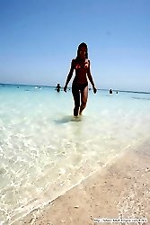 A girl taking off her swimsuit and posing nude on the warm yellow sand