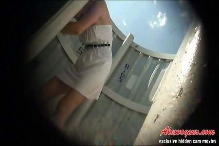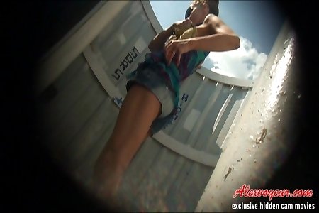 Ass and breasts voyeur tapes of cute ladies changing clothes in changing cabins on the beach
