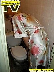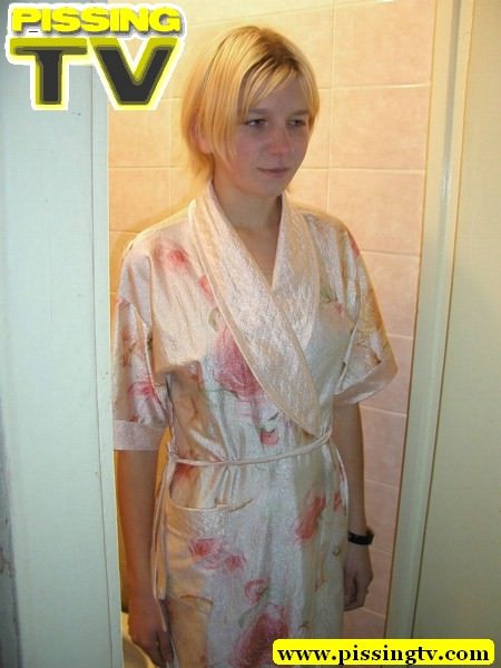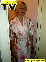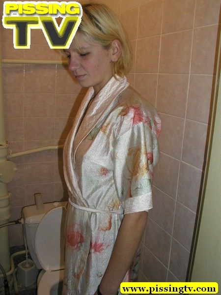 Blonde slim teen with hairless pussy pissing in toilet