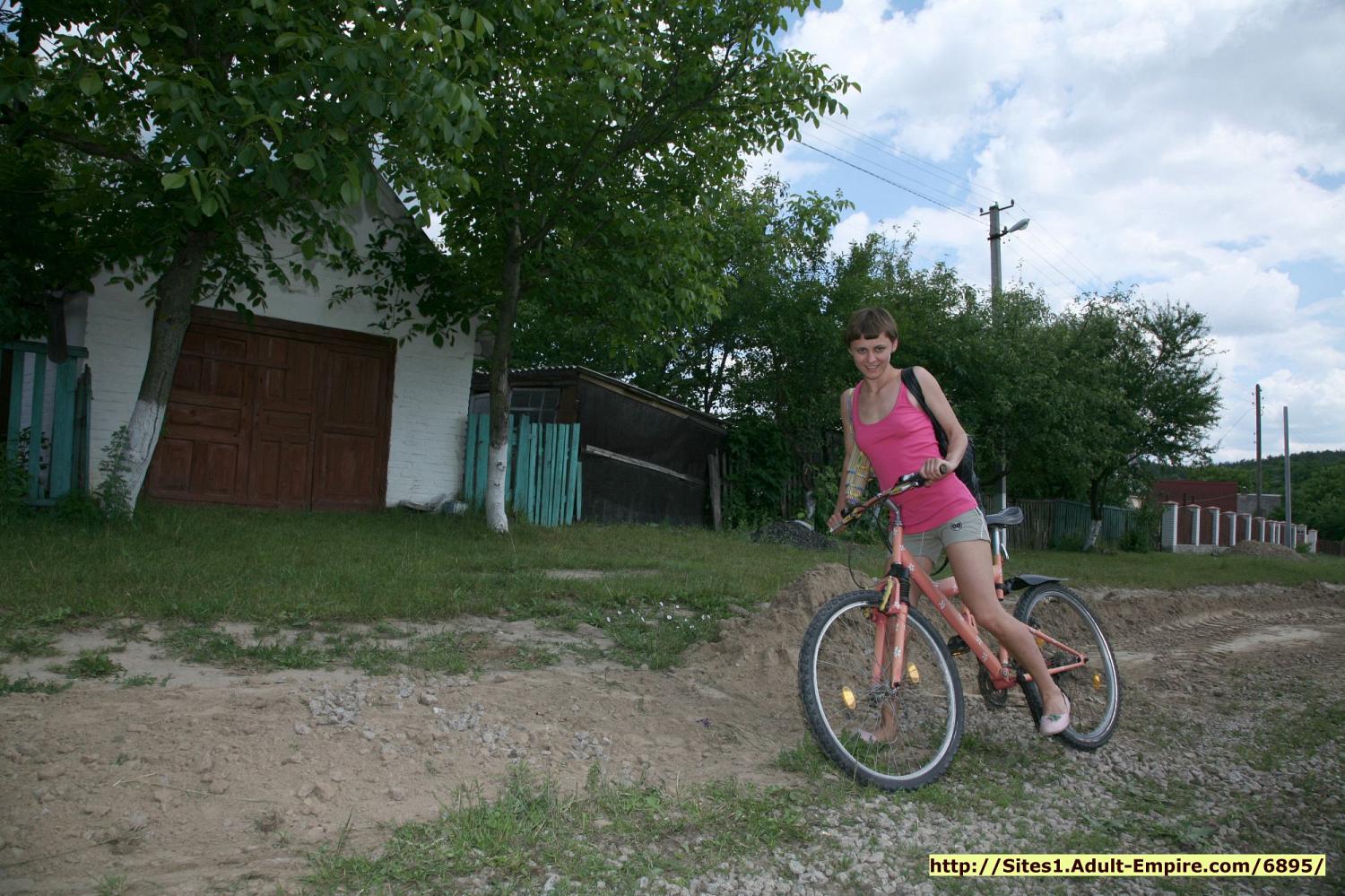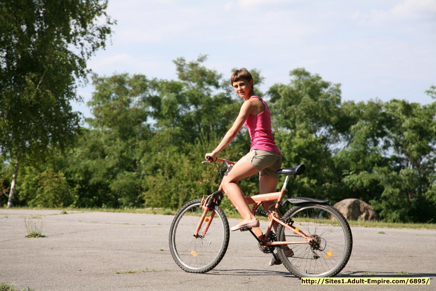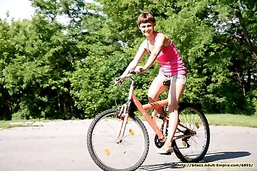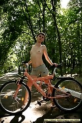 Eighteen years Russian chick getting naked and riding by bicycle in the nude