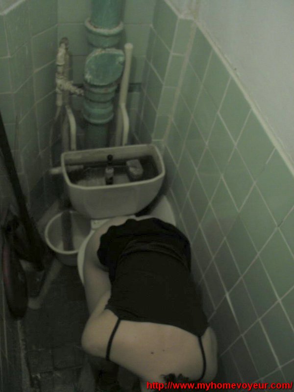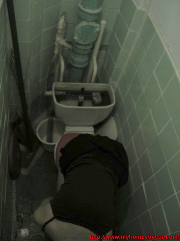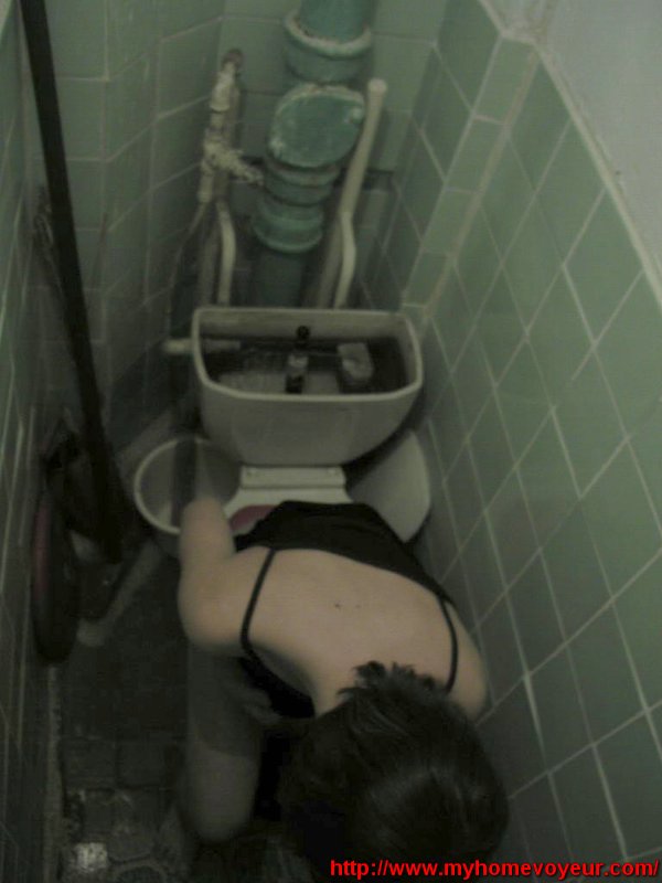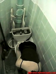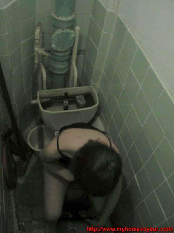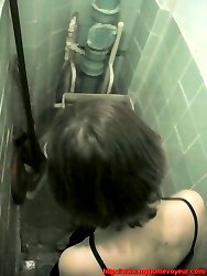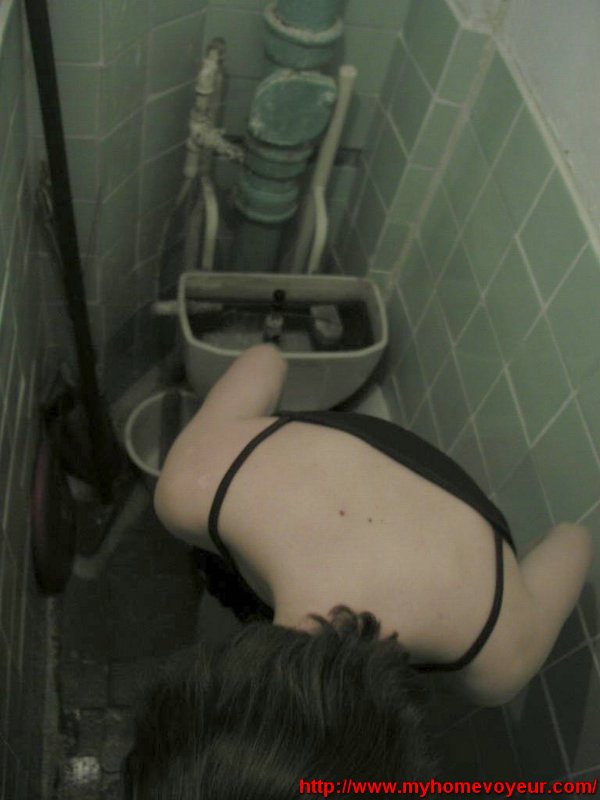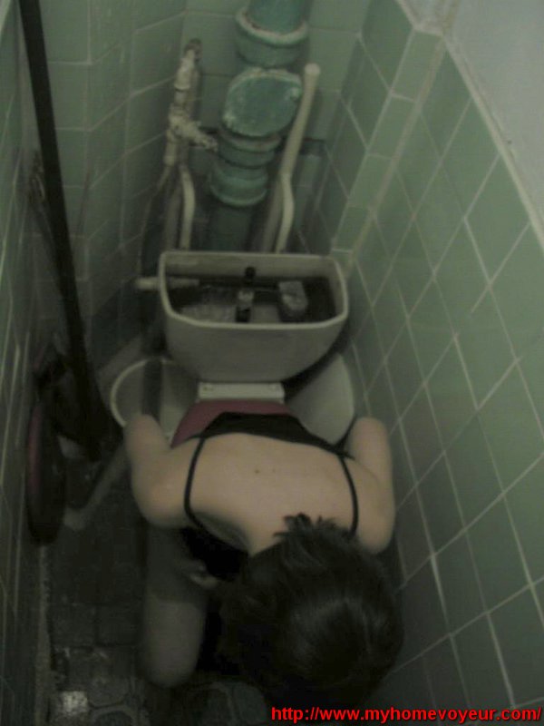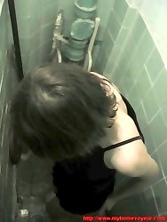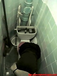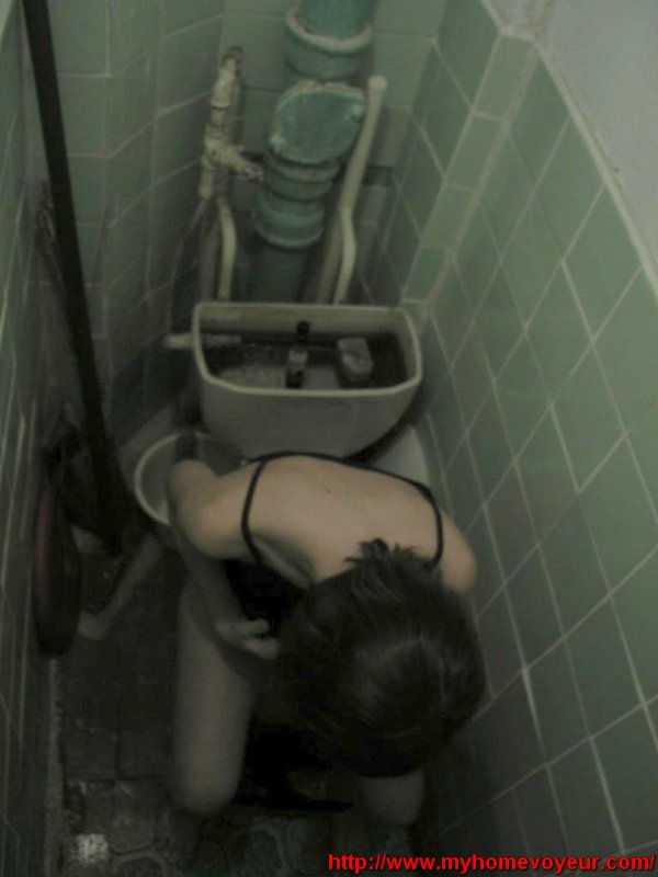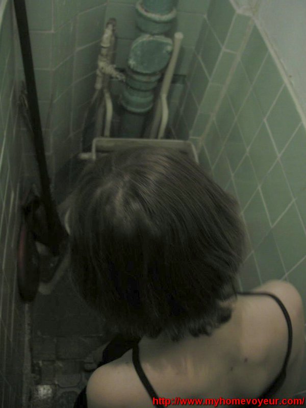 High angle shooting of unsuspicious cutie on the piss-can by toilet voyeur camera
