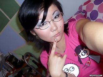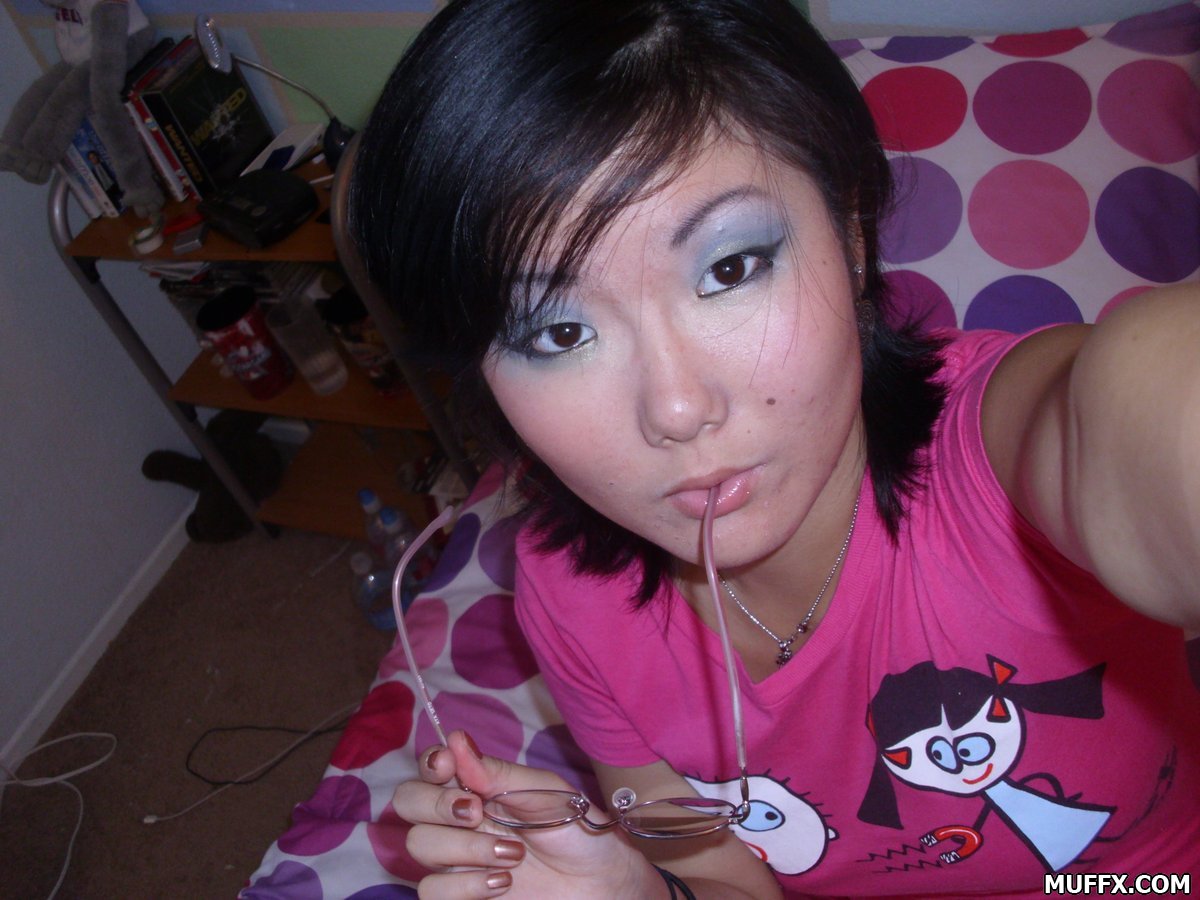 Nice Asian babe raise shirt to show her tits before her fingers caress her pussy