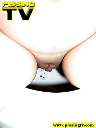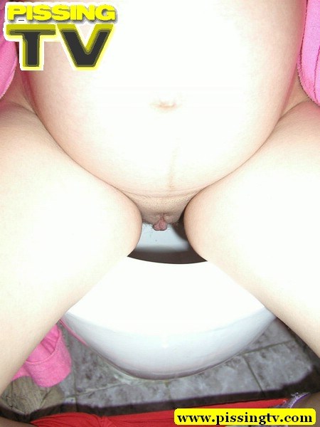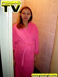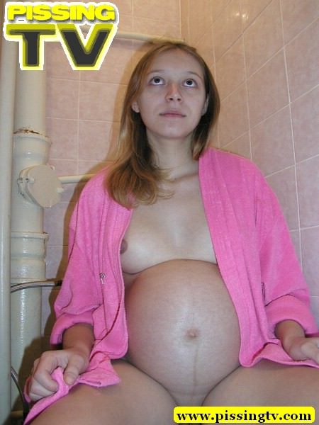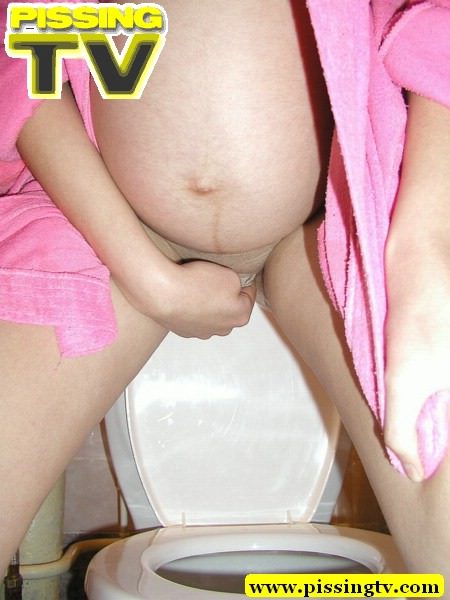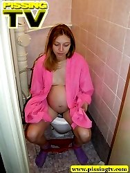 Pregnant teen in pink dress-gown pissing in the toilet