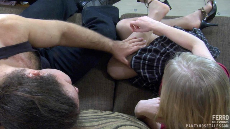 Pretty girl in a pleated skirt and barely visible hose gets drunk and dirty