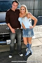 Sexy big tit wife gets on her knees to suck a massive new dick