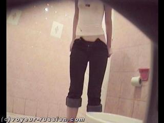 Unsuspecting cutie pulls her denim breeches down in the toilet letting sly voyeur film her tinkling