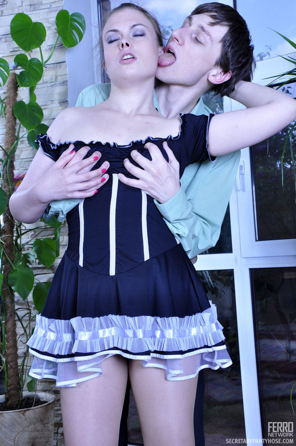 Upskirt French maid in barely there hose groped and boned by a young master