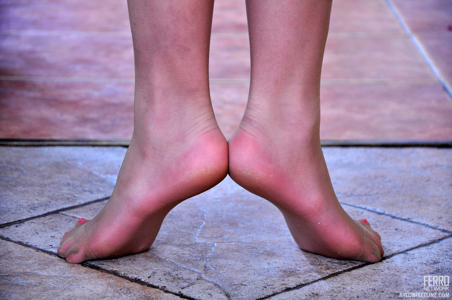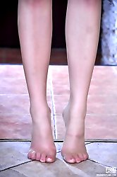 Upskirt teaser showing off her feet in nude pantyhose and coral spike heels