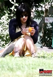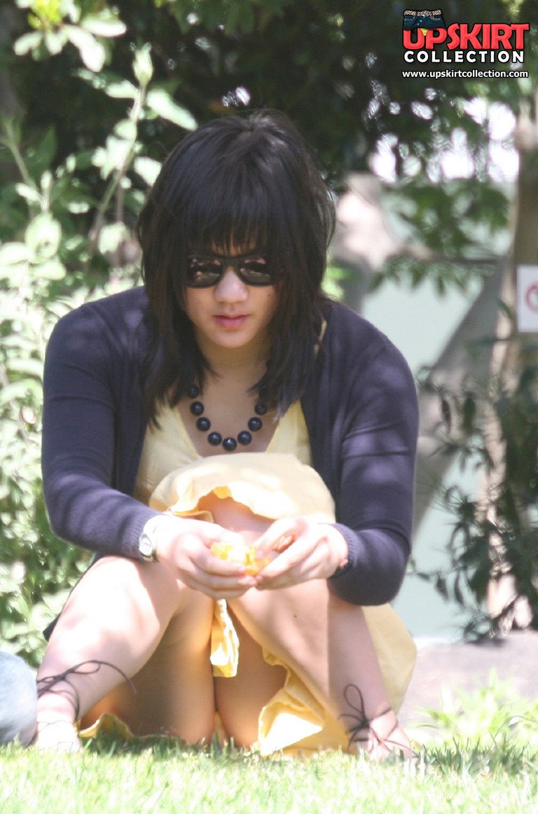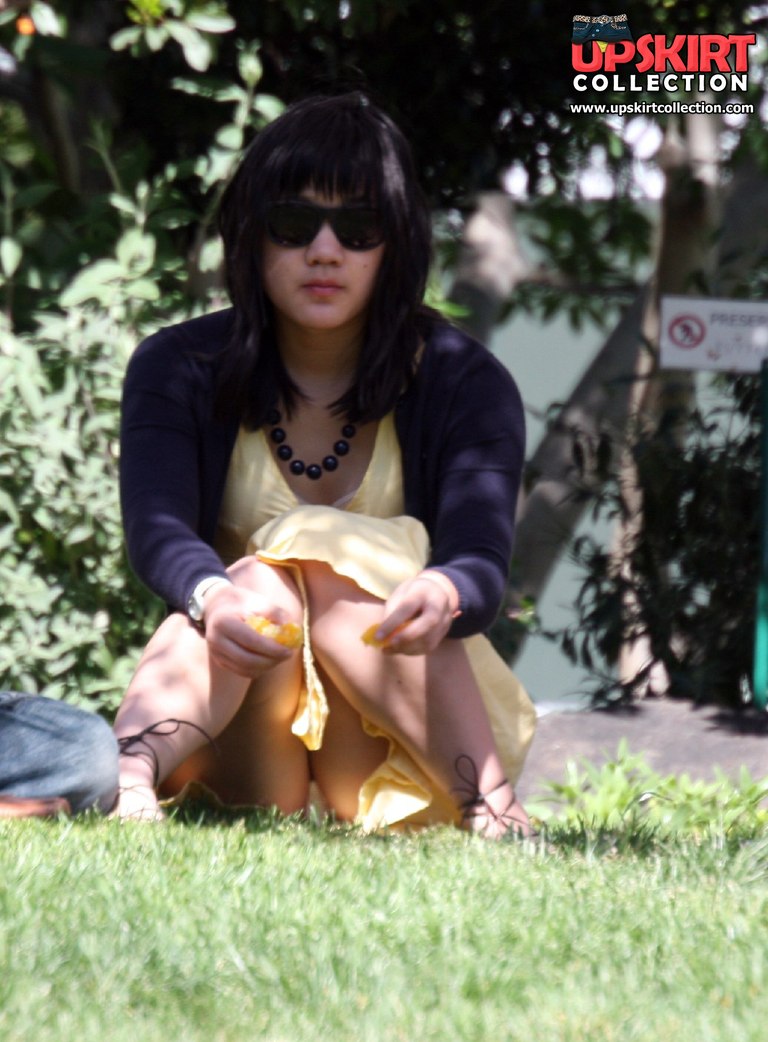 Upskirt. Voyeur up yellow skirt in public