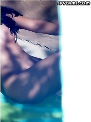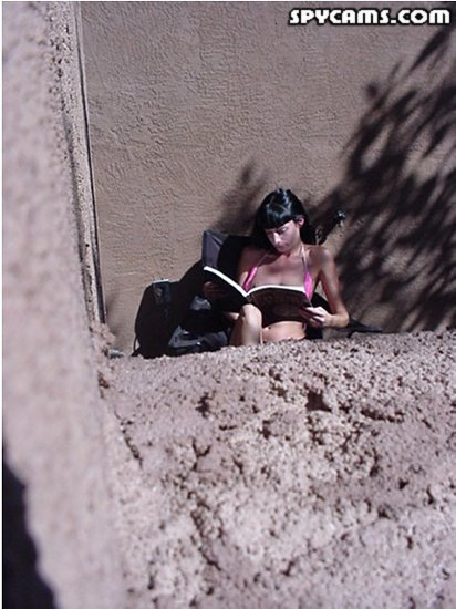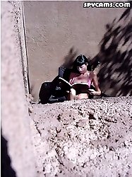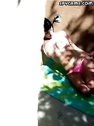 Voyeur pics of a hot brunette topless sunbathing
