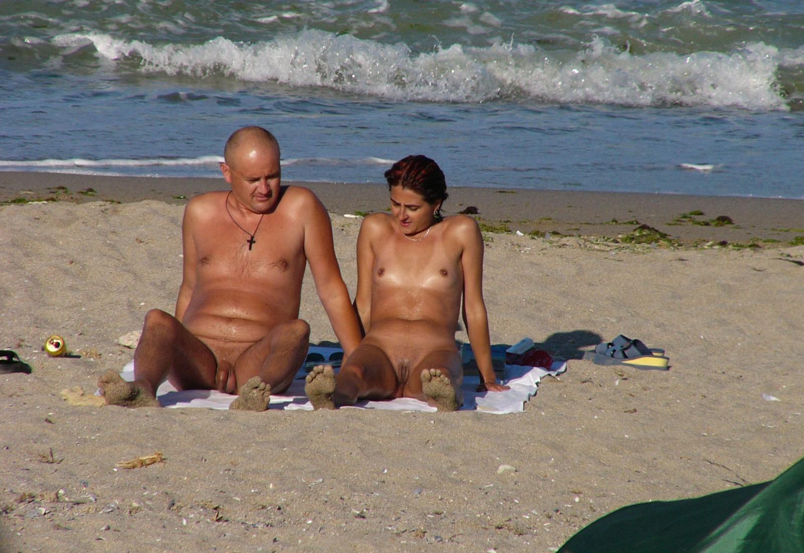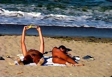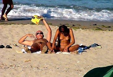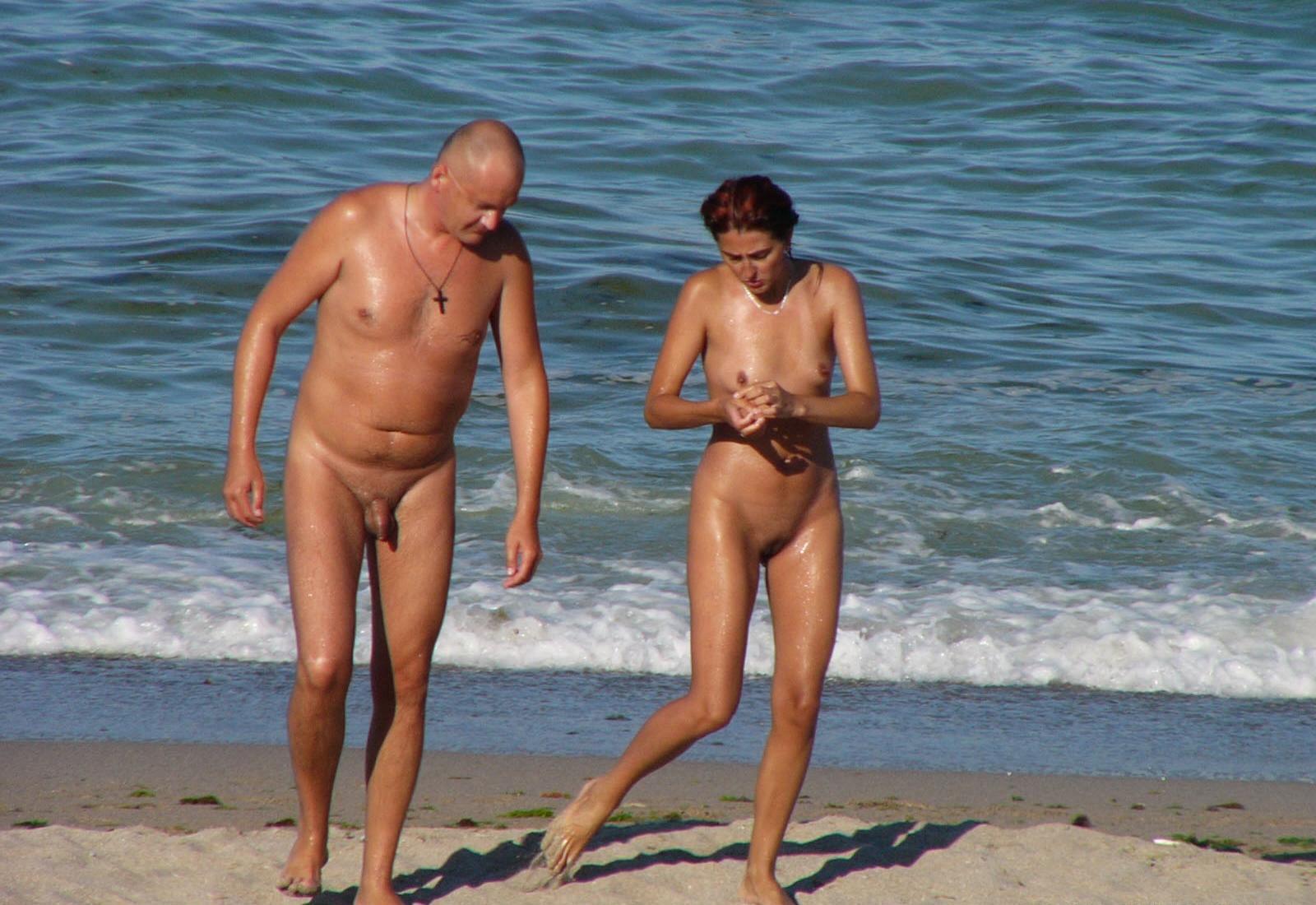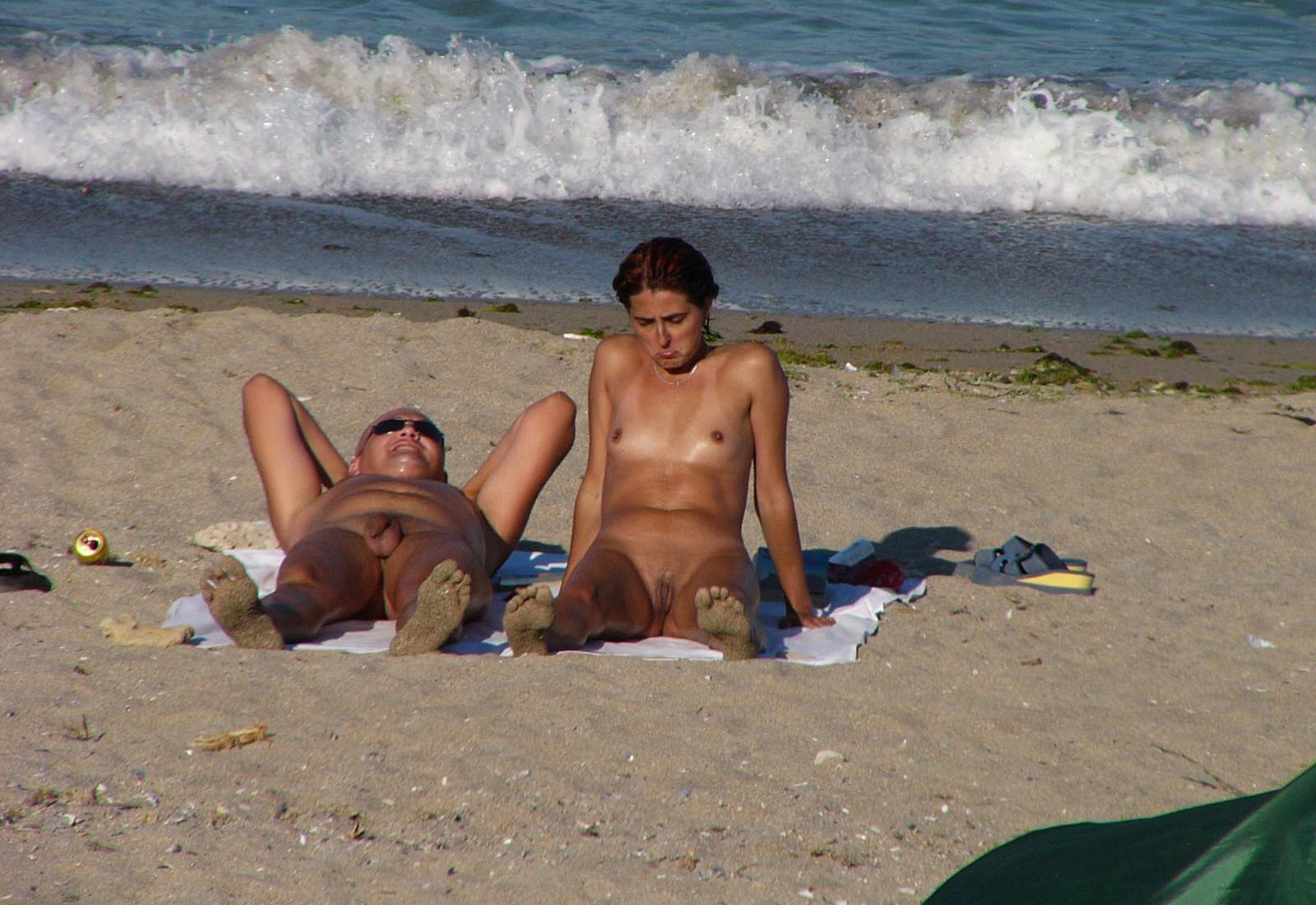 Voyeur pictures of a middle aged couple of suntanned nudists