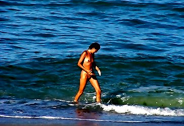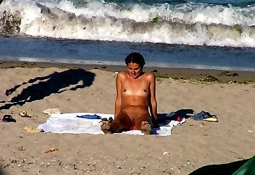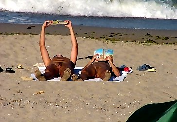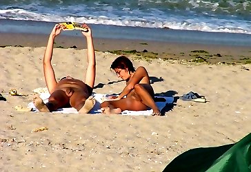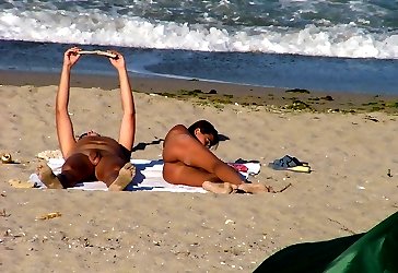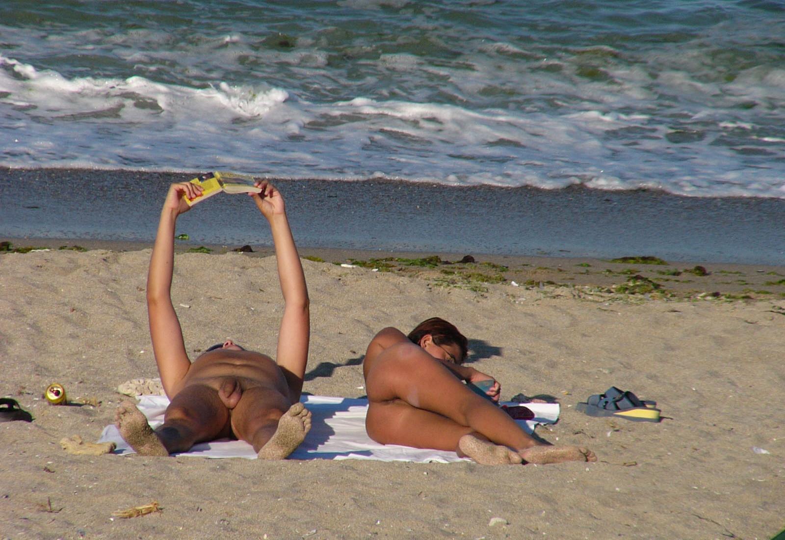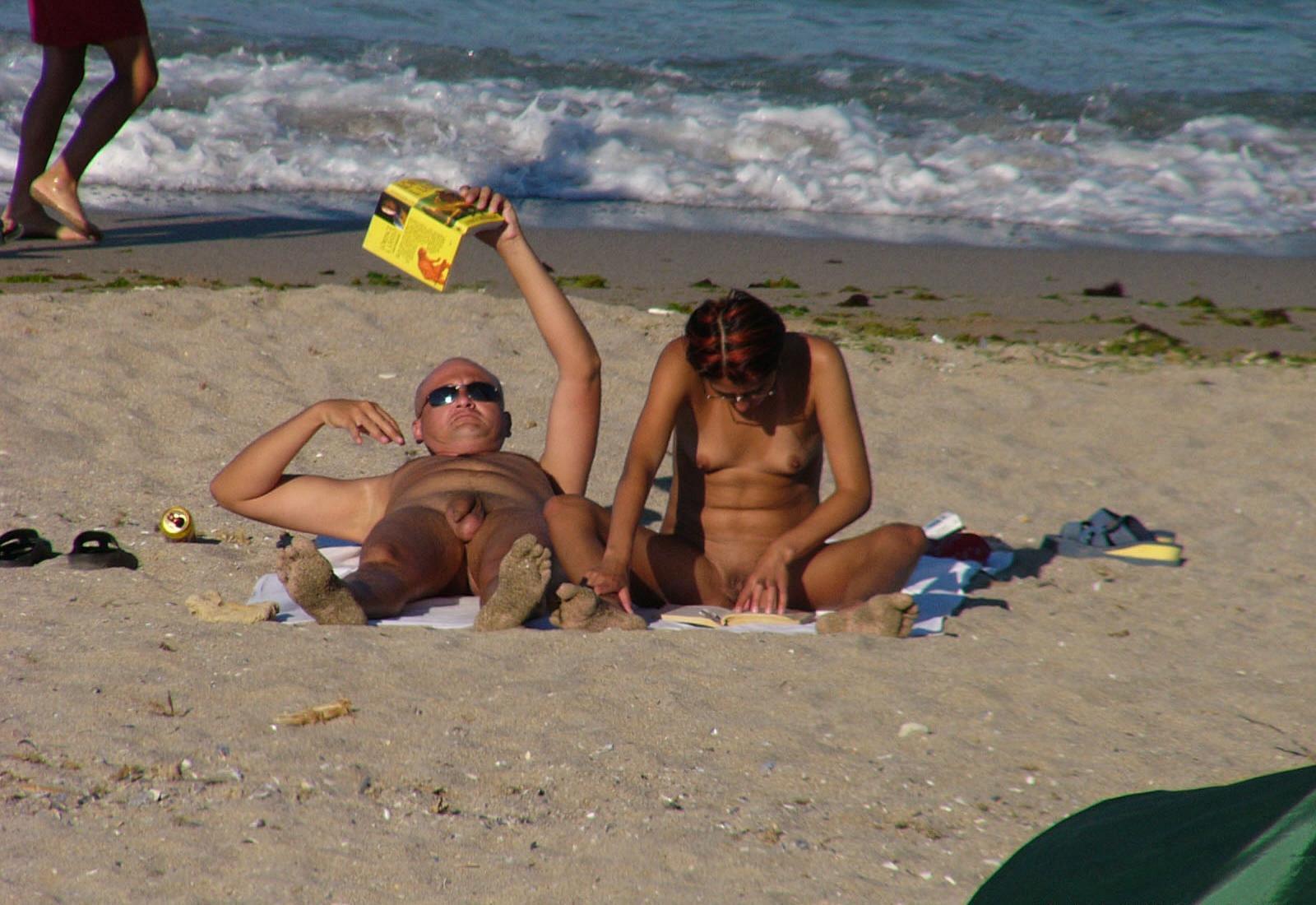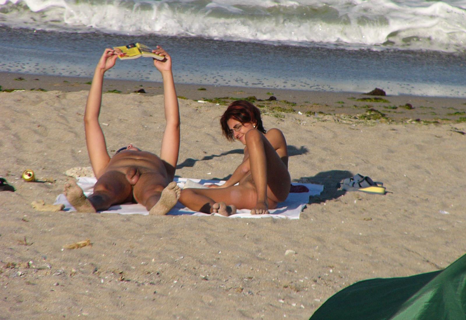 Voyeur pictures of a middle aged couple of suntanned nudists